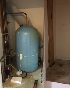 New boiler installation carried out in Carfin, this was replacing an old conventional boiler with an Ideal Exclusive combi boiler with 5 years warranty. Our customer had only just bought their new home and wanted us in right away to change their boiler prior to a new kitchen being installed. The main benefits to changing to an A-rated combi boiler are increased hot water pressure throughout your home, reduced gas bills and freeing up space by removing your hot water cylinder as shown below.